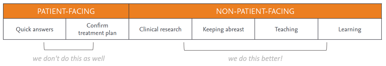 The product has long been regarded as a “reference” tool because it primarily surfaces long-form content (10min+ read time, like books and full journal articles). “Reference users” like medical librarians and researchers are the main users, and they value it for the breadth and depth of content served. However, commercial research exposed an opportunity to better serve an existing and growing user base of clinicians who struggled to find easily consumable content on the existing site.