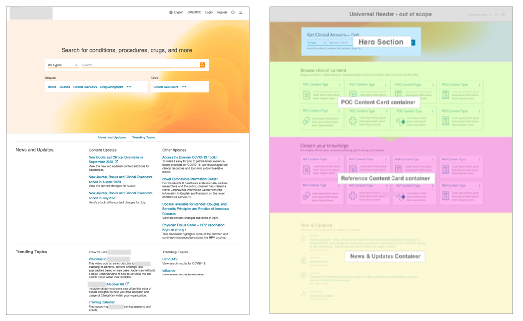 This homepage redesign was for a global flagship product platform that has existed in the market for ~10 years. This product is a search engine that surfaces content authored/published/owned by the company, a major medical publisher. When my family asked what I do for a living, I told them that I worked on “a product that is basically Google for clinicians”.
