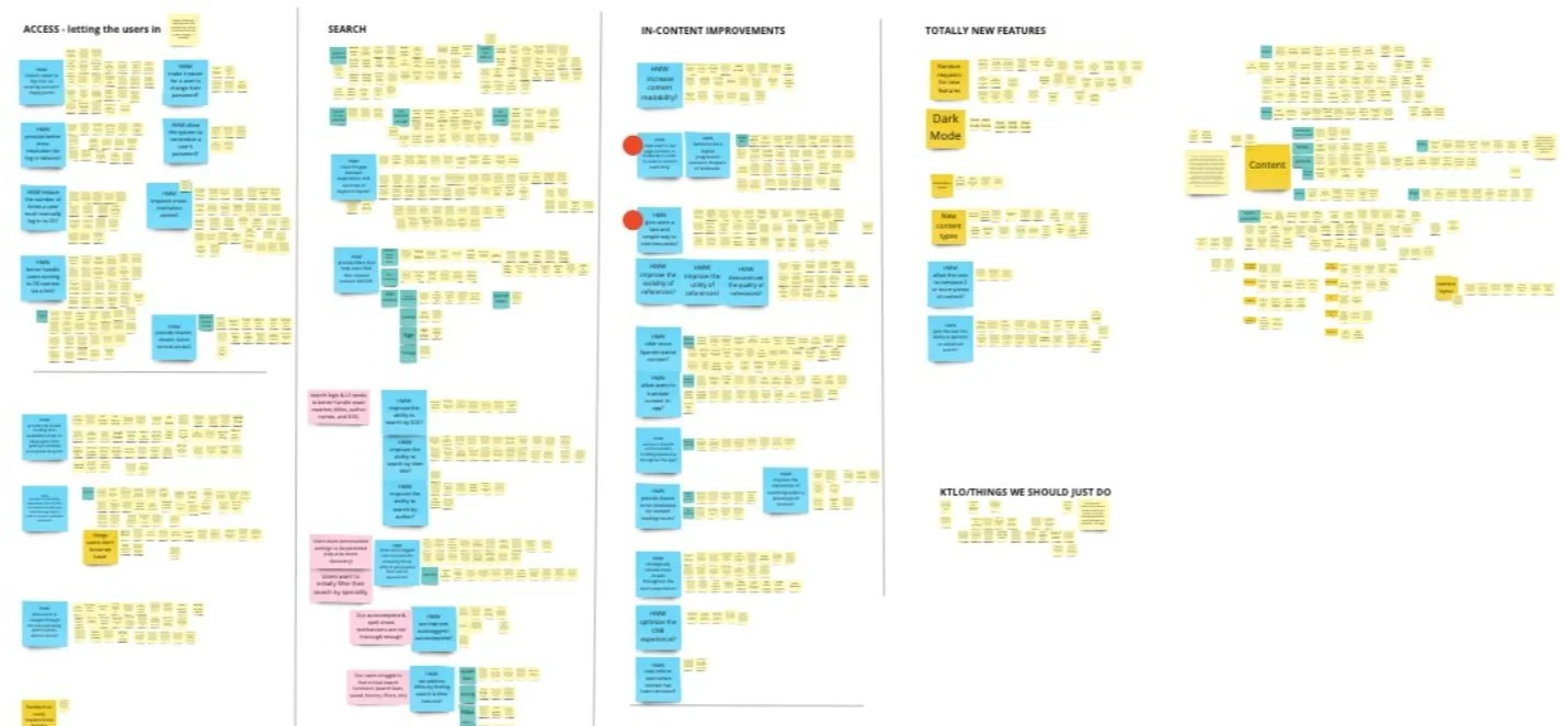 I got creative to gather user feedback and pull out insights: I learned that the marketing insights team would pull survey results from an in-app questionnaire, generating ~100 unique responses/week to multiple-choice and open-form questions. I asked to be added to the report listserv and used the data to start affinity mapping by theme and feature.