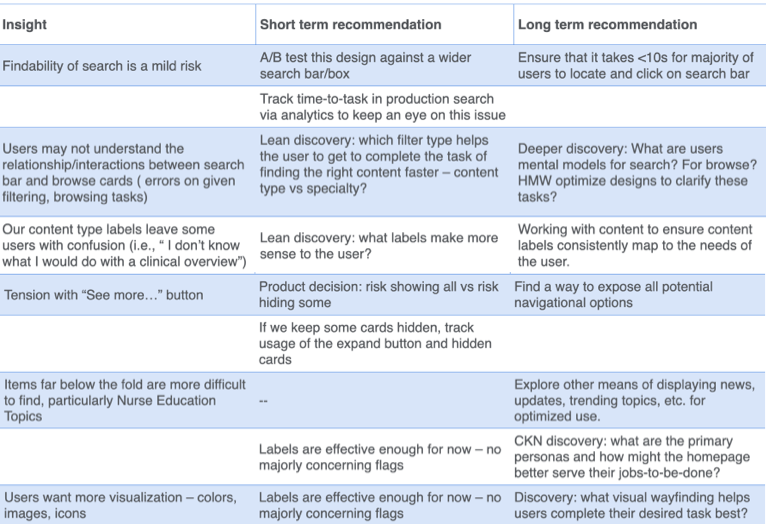 I analyzed our research feedback to articulate short-term recommendations for updating the UI and long-term recommendations for digging deeper into issues uncovered by testing.