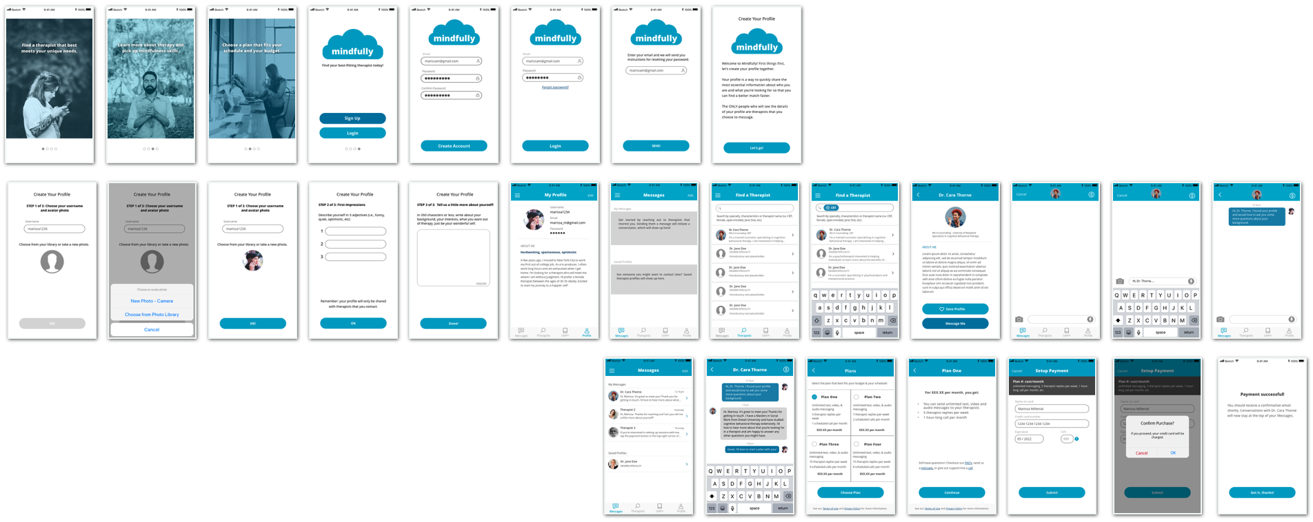 As each of my user flows became more fleshed out, I started translating my basic flows to the digital space. To start, I laid out on 3 flows: messaging a new therapist, starting a plan with a therapist, and creating a user profile.
